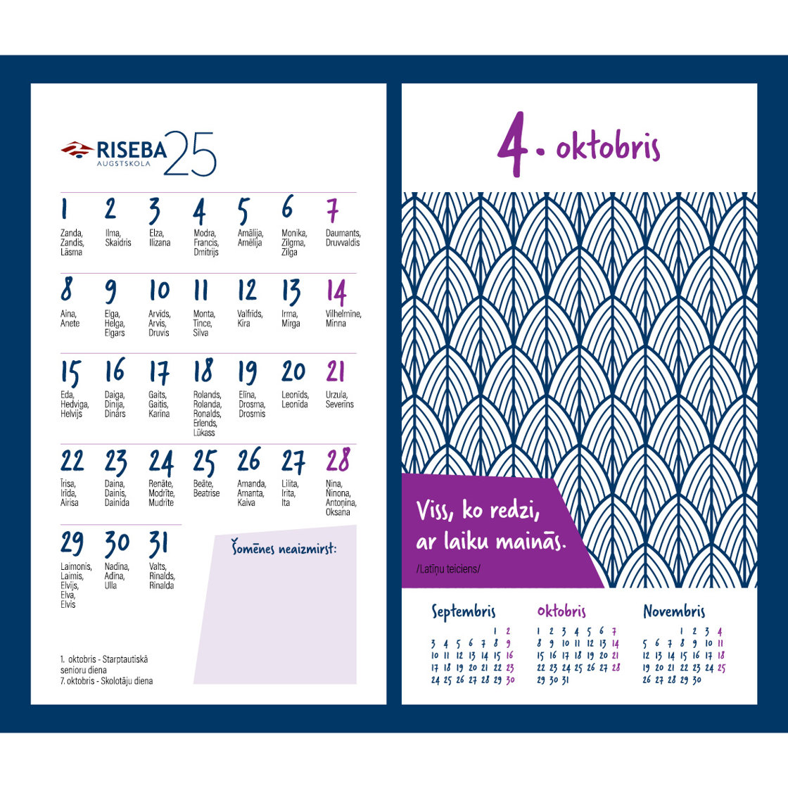 Kalendārs tapa par godu augstskolas RISEBA 25. gadu jubilejai. Kalendārā ir 380 lpp., sadalītas divos pāršķiramos blokos, kuri tiek pamīšus pa mēnešiem pāršķirti.